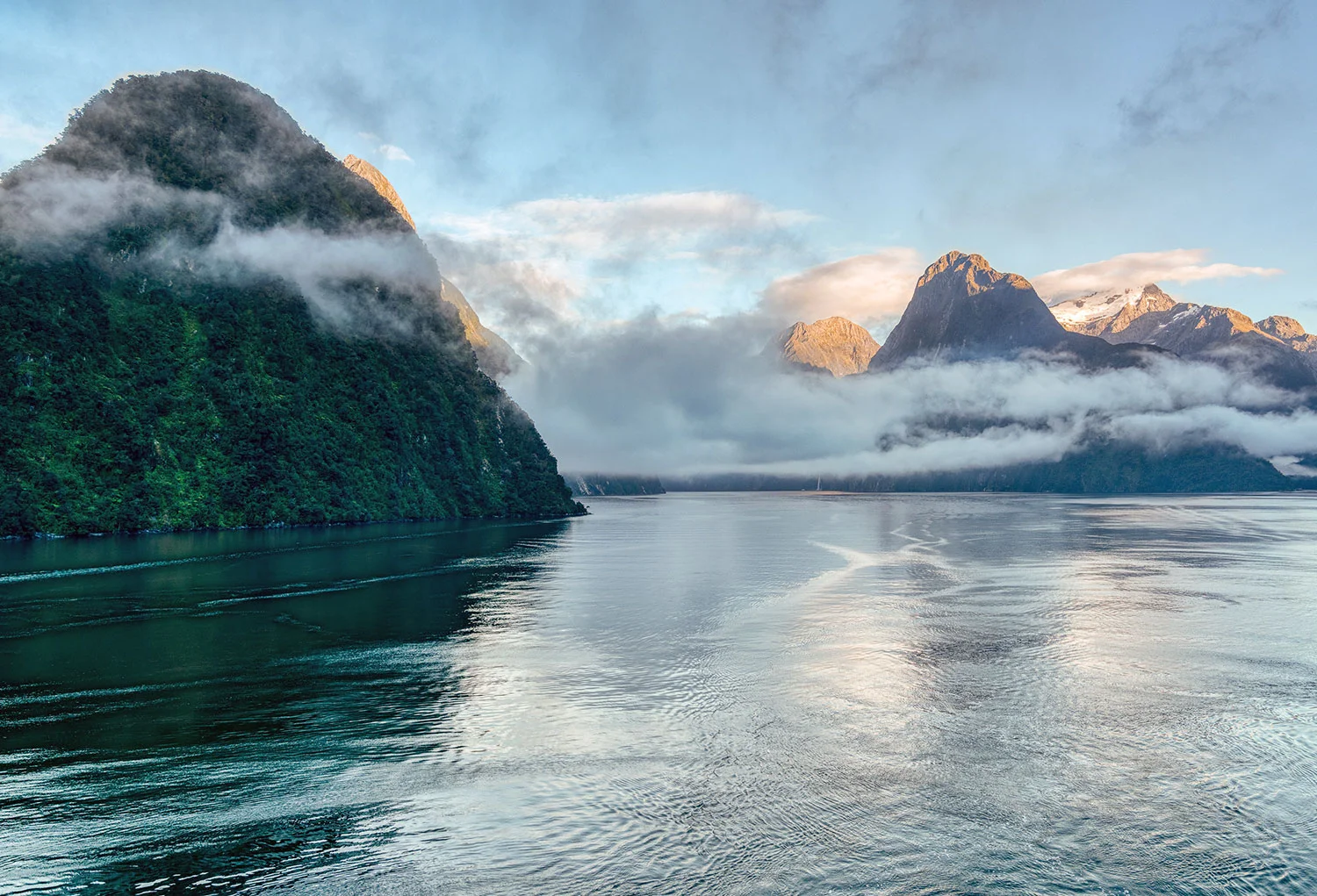 After 2 days crossing the Tasman Sea, we reached New Zealand where the ship cruised slowly through Fiordland National Park, where beautiful green mountains rise steeply from the serene waters.