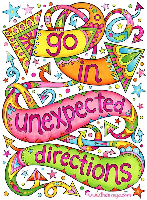 My positive phrases are designed to spread the joy of optimism through color and detail. Each drawing begins as a rough pencil sketch that is carefully honed into the final composition. As I draw, I look for ways to inject whimsy into the words, to help bring the phrase to life. Once the composition is complete, I either scan and color the artwork digitally or color it by hand using materials such as Copic Sketch markers (my favorite!), Uni-Posca paint pens, Staedtler Triplus Fineliners, Prismacolor Premier colored pencils, and more.